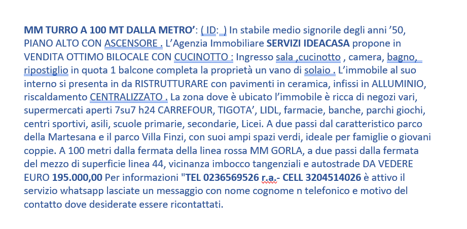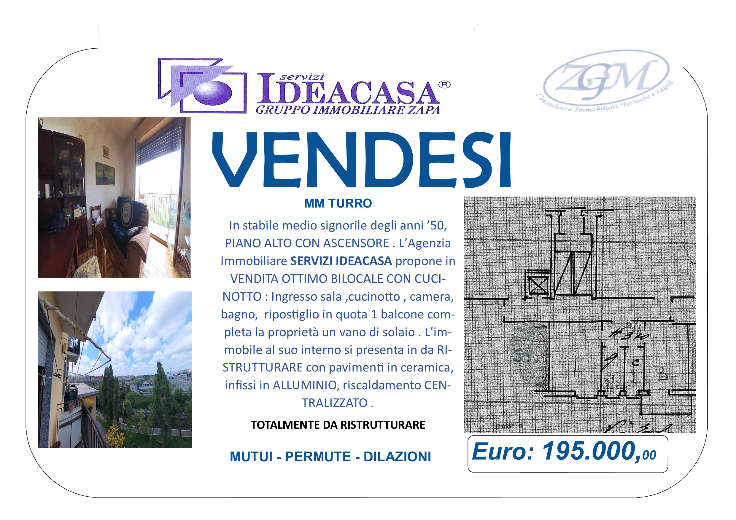 MM TURRO A 100 MT DALLA METRO’: ( ID:  ) In stabile medio signorile degli anni ’50, PIANO ALTO CON ASCENSORE . L’Agenzia Immobiliare SERVIZI IDEACASA propone in VENDITA OTTIMO BILOCALE CON CUCINOTTO : Ingresso sala ,cucinotto , camera, bagno,  ripostiglio in quota 1 balcone completa la proprietà un vano di solaio . L’immobile al suo interno si presenta in da RISTRUTTURARE con pavimenti in ceramica, infissi in ALLUMINIO, riscaldamento CENTRALIZZATO . La zona dove è ubicato l’immobile è ricca di negozi vari, supermercati aperti 7su7 h24 CARREFOUR, TIGOTA’, LIDL, farmacie, banche, parchi giochi, centri sportivi, asili, scuole primarie, secondarie, Licei. A due passi dal caratteristico parco della Martesana e il parco Villa Finzi, con suoi ampi spazi verdi, ideale per famiglie o giovani coppie. A 100 metri dalla fermata della linea rossa MM GORLA, a due passi dalla fermata del mezzo di superficie linea 44, vicinanza imbocco tangenziali e autostrade DA VEDERE EURO 195.000,00 Per informazioni “TEL 0236569526 r.a.- CELL 3204514026 è attivo il servizio whatsapp lasciate un messaggio con nome cognome n telefonico e motivo del contatto dove desiderate essere ricontattati.