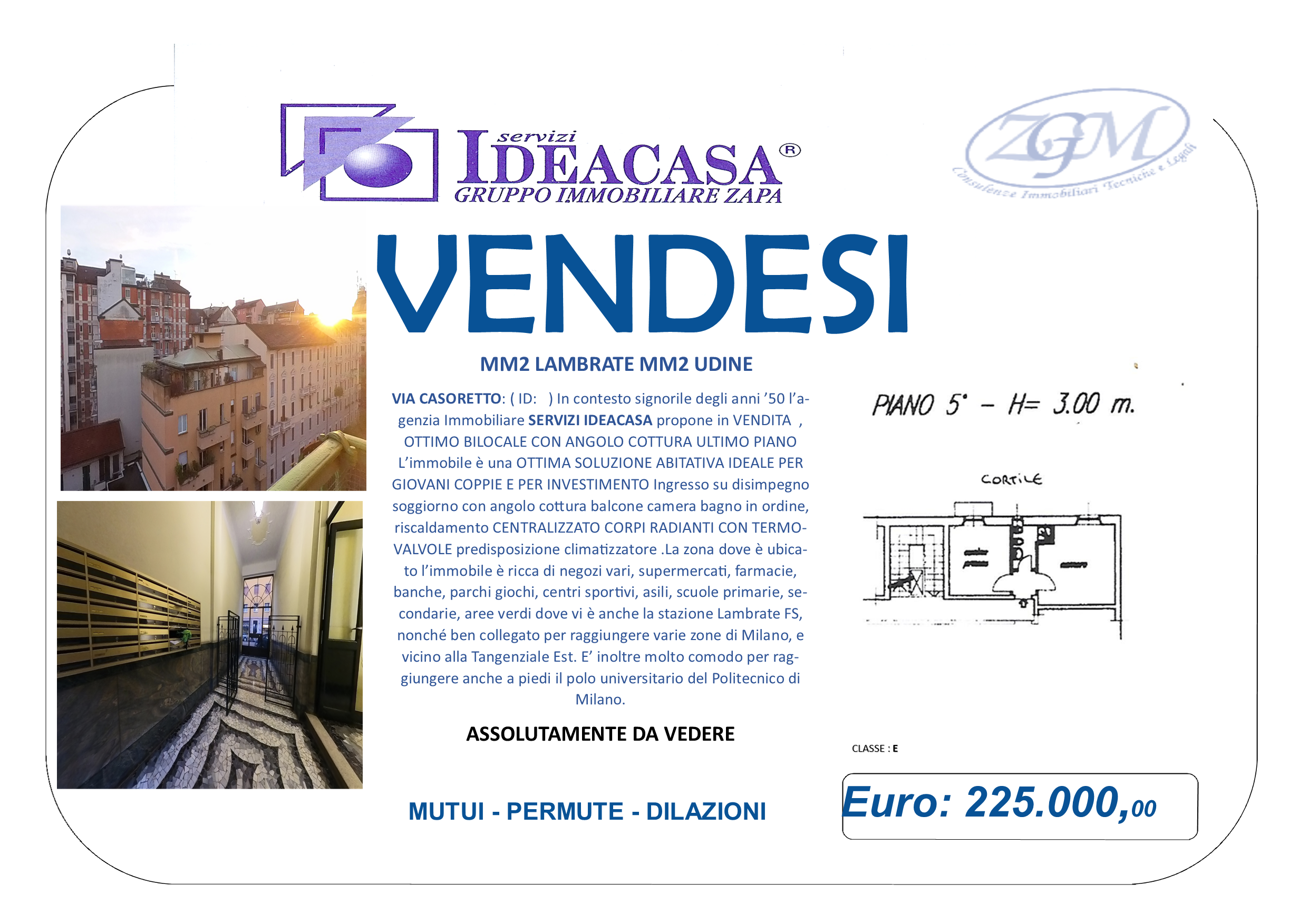 MM2 UDINE \ MM2 LAMBRATE a soli 400 mt dalla fermata della metrò VIA CASORETTO: ( RIF ID: ) In contesto signorile degli anni ’50 l’agenzia Immobiliare SERVIZI IDEACASA propone in VENDITA , OTTIMO BILOCALE CON ANGOLO COTTURA ULTIMO PIANO PANORAMICO L’immobile è una OTTIMA SOLUZIONE ABITATIVA IDEALE PER GIOVANI COPPIE E PER INVESTIMENTO Ingresso su disimpegno soggiorno con angolo cottura balcone camera bagno in ordine, riscaldamento CENTRALIZZATO CORPI RADIANTI CON TERMOVALVOLE predisposizione climatizzatore La zona dove è ubicato l’immobile è ricca di negozi vari, supermercati, farmacie, banche, parchi giochi, centri sportivi, asili, scuole primarie, secondarie, aree verdi dove vi è anche la stazione Lambrate FS, nonché ben collegato per raggiungere varie zone di Milano, e vicino alla Tangenziale Est. E’ inoltre molto comodo per raggiungere anche a piedi il polo universitario del Politecnico di Milano.