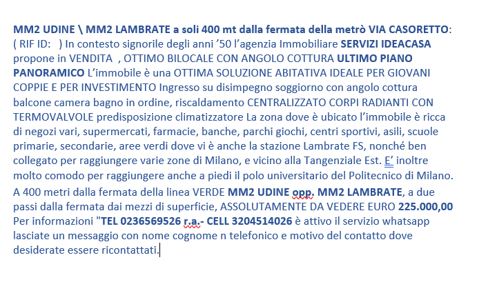 A 400 metri dalla fermata della linea VERDE MM2 UDINE opp. MM2 LAMBRATE, a due passi dalla fermata dai mezzi di superficie, ASSOLUTAMENTE DA VEDERE EURO 225.000,00 Per informazioni “TEL 0236569526 r.a.- CELL 3204514026 è attivo il servizio whatsapp lasciate un messaggio con nome cognome n telefonico e motivo del contatto dove desiderate essere ricontattati.